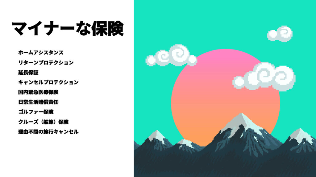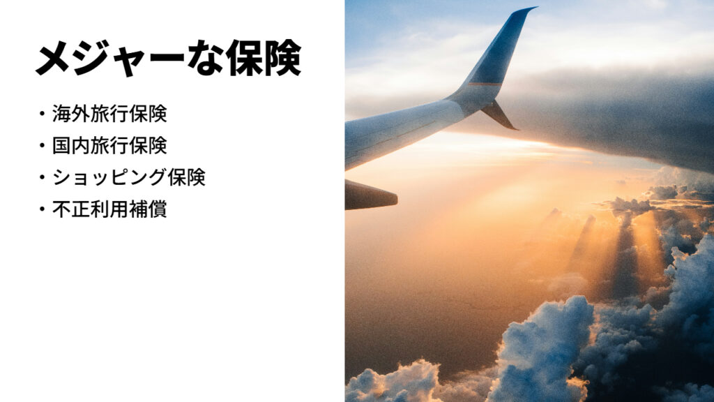 クレジットカード付帯保険の代表格と言えば「旅行保険」やショッピング保険でしょう。