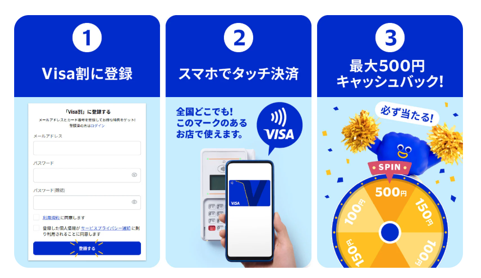 - 「Visa割」に登録する まずはキャンペーンサイトから、お持ちのVisaカード番号とメールアドレスを登録します。これが「参加券」になります。