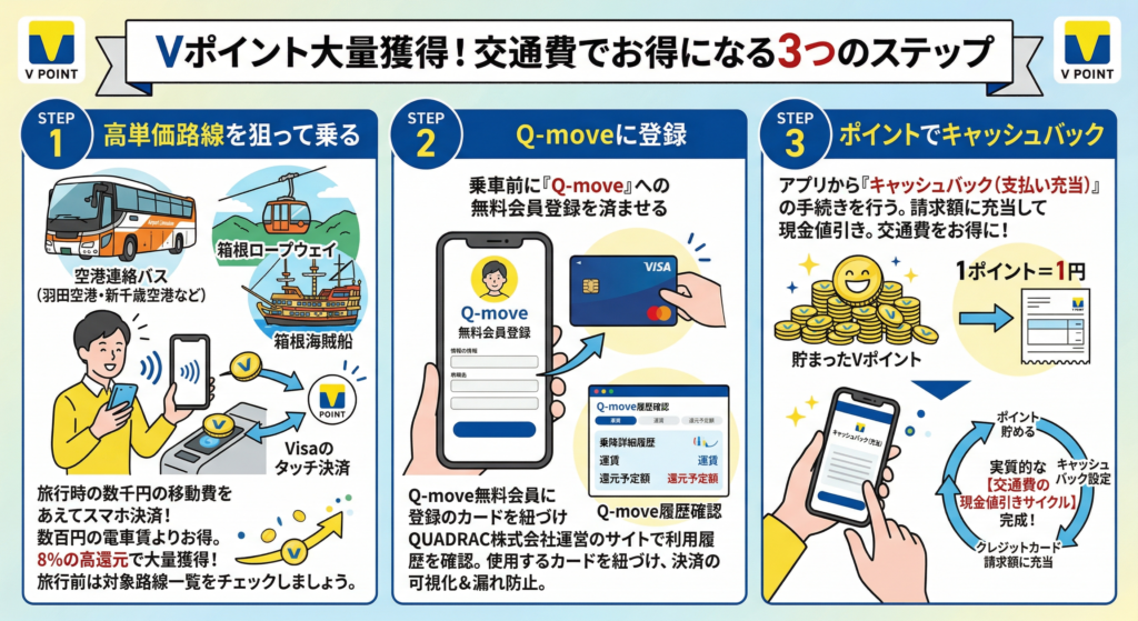 8%という高還元で大量に貯まったVポイントは、1ポイント=1円としてクレジットカードの請求額に充当できます。アプリから「キャッシュバック(充当)」の手続きを行うステップを踏むことで、実質的な【交通費の現金値引きサイクル】を完成させることができます。