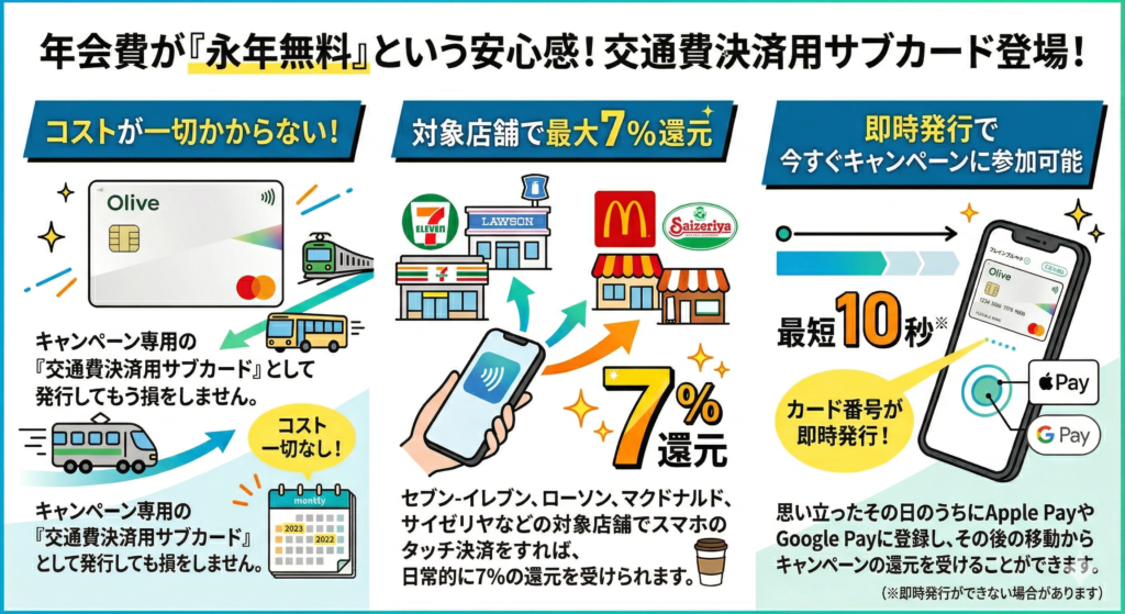 - 年会費が「永年無料」という安心感 コストが一切かからないため、今回のキャンペーン専用の「交通費決済用サブカード」として発行しても損をすることがありません。